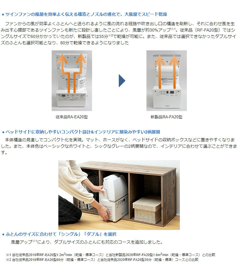 従来品(RF-FA20型)ではシングルサイズで60分かかっていたのが、新製品では35分※2で乾燥が可能に。